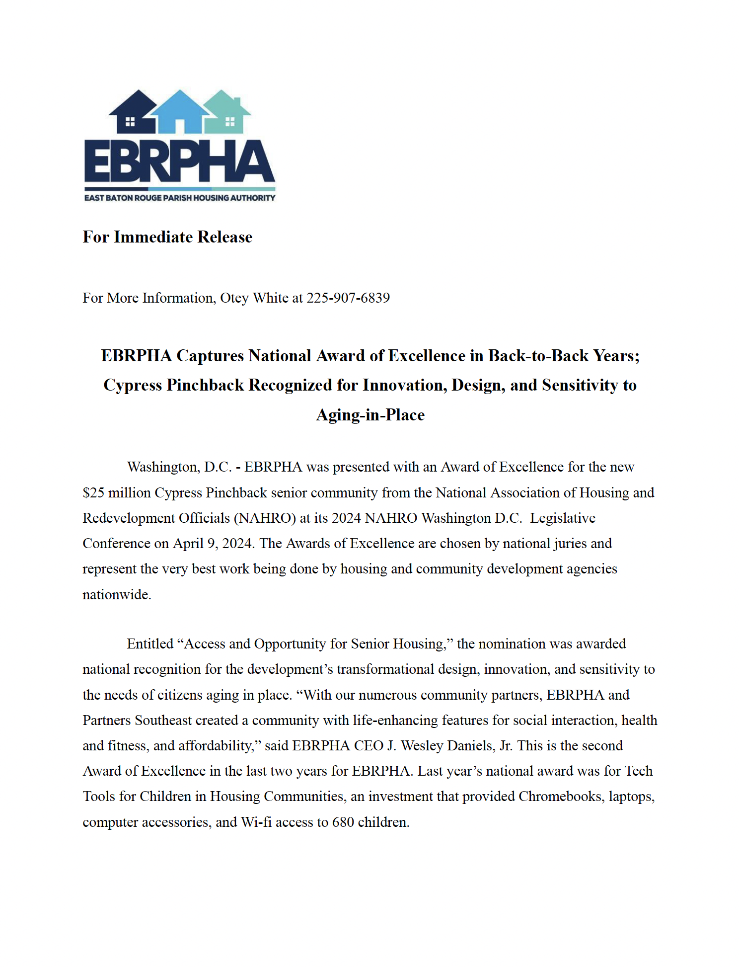 EBRPHA Captures National Award of Excellence in Back-to-Back Years